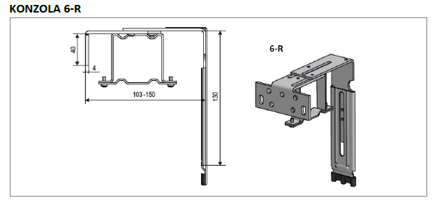 Konzola pre montáž krycieho plechu vonkajších žalúzií s krátkou dosadacou plochou, ktorú je možné použiť pri montáži žalúzie na rám okna, resp. tam, kde nie je dostatok miesta pre kotvenie iného typu konzoly. Ide o nastaviteľnú konzolu (nastaviteľná hĺbka - rozmer B). Dostupné sú dva typy s rôznym rozsahom nastavenia. Konzoly sú vyrobené z oceľového plechu hrúbky 3 mm, povrchovo upravené pozinkovaním. Je možné ich doplniť o predĺženie typu A, B alebo C.