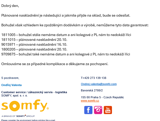 Informujeme zákazníkov, že vzhľadom k oneskoreným dodávkam vo výrobe, nám spoločnosť SOMFY nemôže garantovať prisľúbené termíny.